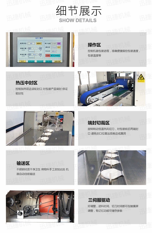 一次性口罩包裝設備口罩包裝機可用于餅干、月餅、蛋黃派、米餅、雪糕、方便面、巧克力等塊狀產品的包裝,特別適合于小批量單一產品的包裝。