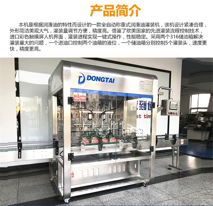 本機(jī)是根據(jù)潤(rùn)滑油的特性而設(shè)計(jì)的一款全自動(dòng)稱重式潤(rùn)滑油灌裝機(jī),該機(jī)設(shè)計(jì)緊湊合理,外形簡(jiǎn)介美觀大氣,灌裝量調(diào)節(jié)方便,精度高。借鑒了歐美國(guó)家的灌裝流程控制技術(shù),彩色觸摸屏人機(jī)界面,灌裝進(jìn)程實(shí)現(xiàn)一鍵操作,性能穩(wěn)定。采用兩個(gè)316儲(chǔ)油罐解決灌裝量大的問(wèn)題,一個(gè)進(jìn)油口控制兩個(gè)油箱的液位,一個(gè)儲(chǔ)油箱分別控制5個(gè)灌裝頭,速度更快,精度更高。